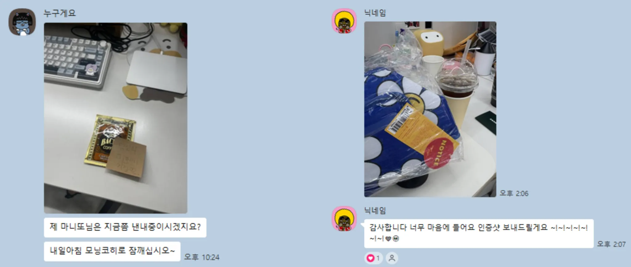 마음이 담긴 선물을 받은 팀원분들께서 인증샷도 남겨주어 선물을 남긴 마니또도
